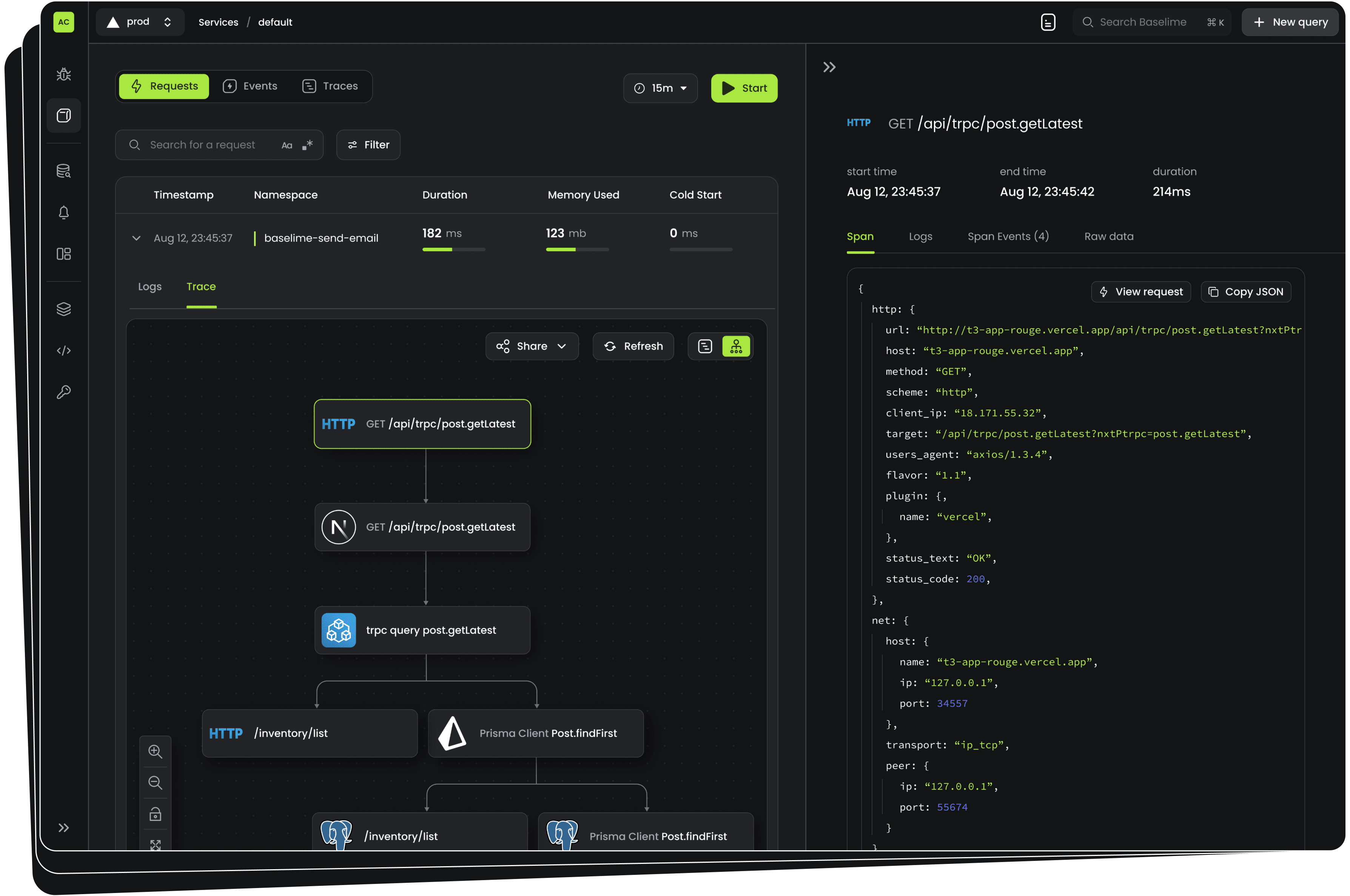 Functions logs, error tracking, distributed tracing and web vitals, all instantly queryable and searchable